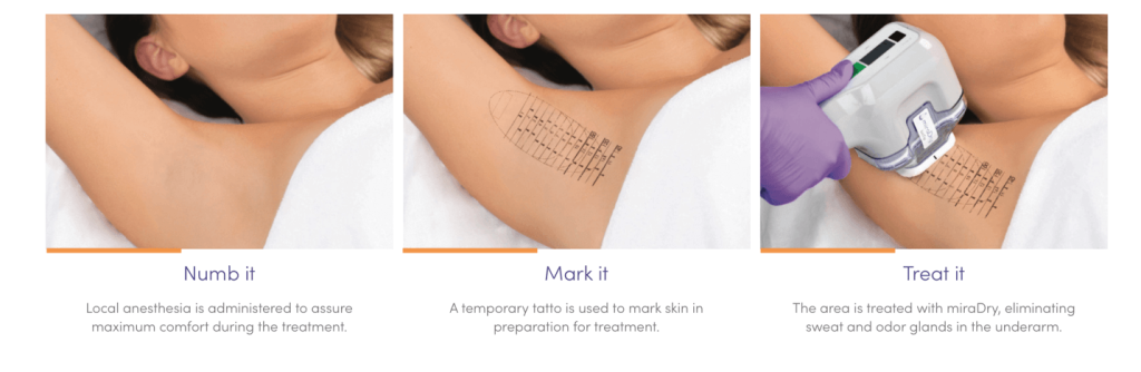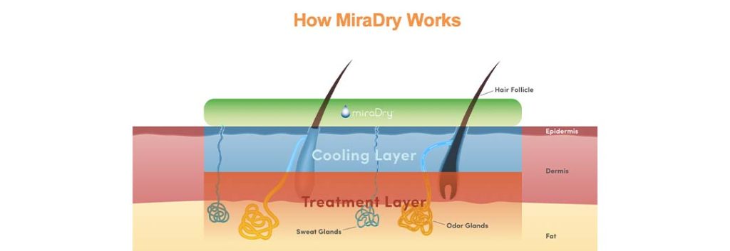 miraDry treatment makes use of thermal energy to form heat in the area that sweats and where he bothersome odor glands reside and safely destroys them.